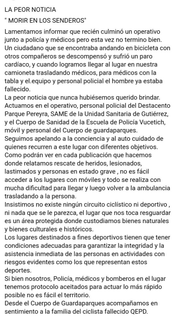 Por último, solicitan: “Insistimos no existe ningún circuito ciclístico ni deportivo, ni nada que se le parezca, el lugar que nos toca resguardar es un área protegida donde custodiamos bienes naturales y bienes culturales e históricos. Desde el Cuerpo de Guardaparques acompañamos en sentimiento a la familia del ciclista fallecido QEPD”.